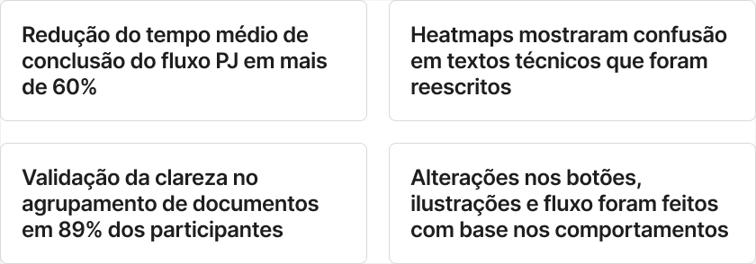 Extraímos insights quantitativos (tempo médio, sucesso, cliques) e qualitativos (pontos de hesitação, abandono, comentários livres). Esses dados nos permitiram antecipar problemas reais antes da implementação.